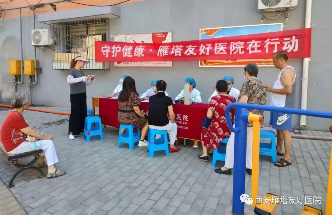 雁塔友好医院组织医疗专家走出院门,坚持每月深入乡村、社区开展健康义诊活动,为百姓免费检查、宣传疾病预防知识,并免费提供医疗保健咨询服务,受到百姓的普遍欢迎。雁塔友好医院秉承:仁道、友好、奉献的精神,为广大居民提供便捷优质高效的诊疗服务,满足人民群众的就医和保健需求,提高广大人民群众自我保健意识和健康水平,为建设幸福雁塔做出贡献。